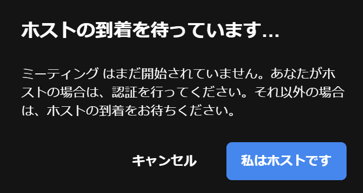 Jitsi Meetトップページにアクセスし、会議室を作成し、「ミーティングに参加」をクリックすると、次のように、「ホストの到着を待っています」のウインドウが表示されます。