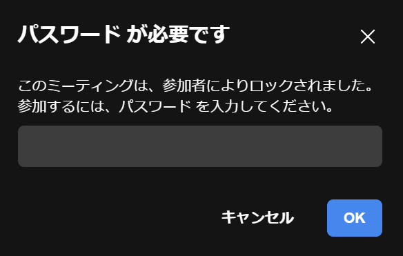 ゲストユーザーは、ミーティングに参加する際に、以下のように、パスワード入力が求められます。