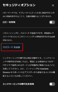 「セキュリティオプション」のウインドウで、「パスワードを追加」から、ゲストユーザー参加時のパスワードを設定します。
